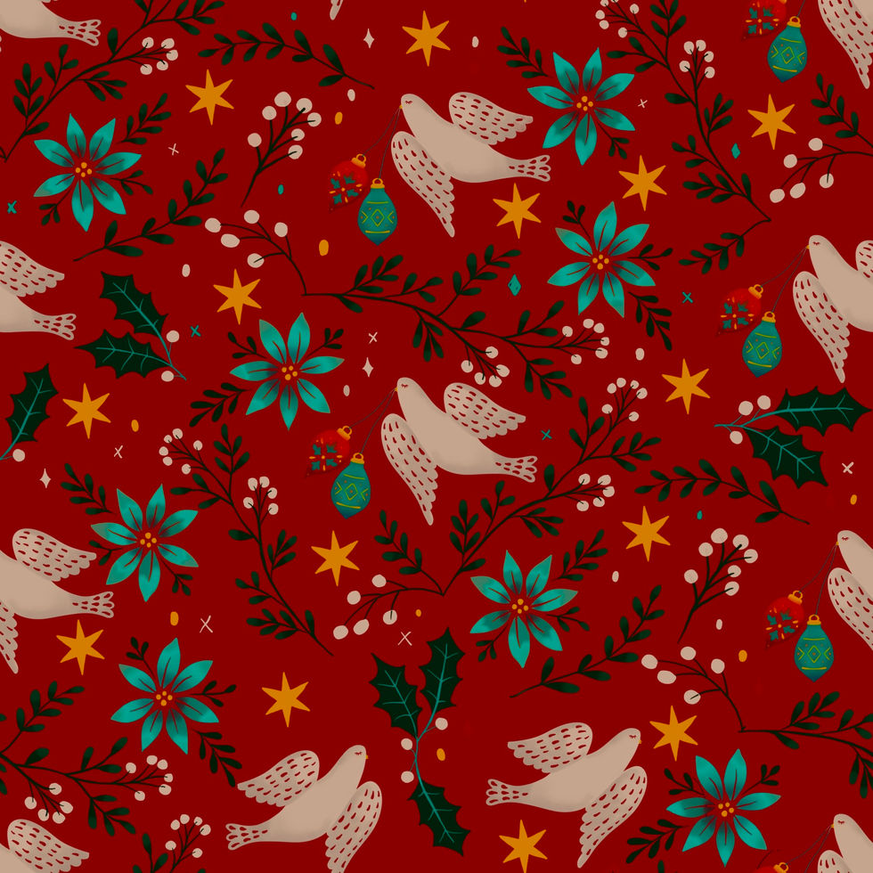 This winter folk collection brings together doves, deer, and blooming poinsettias in deep festive tones. The detailed hero scenes pair with simple coordinates for easy mixing. Ideal for Christmas cards, fabrics, gift wrap, tabletop décor, and seasonal stationery.